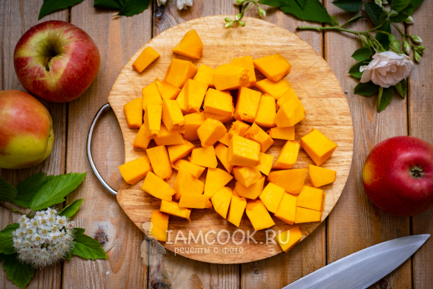 Очистите кусочки тыквы от семян и кожуры, мякоть нарежьте небольшими кубиками.