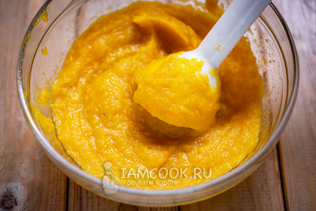 Затем массу из кастрюльки для удобства переложите в просторную миску и перебейте все погружным блендером до получения однородного пюре.