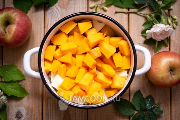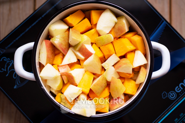 В удобную кастрюльку выложите кубики тыквы и яблок, залейте воду.