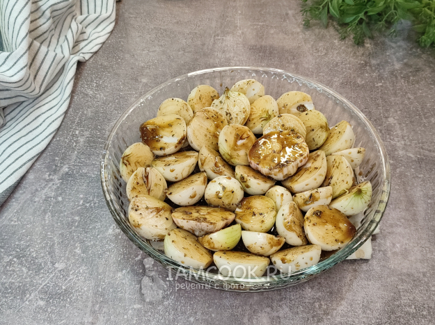 Переложите лук в форму для запекания, туда же положите чеснок. Если в миске остался соус, полейте им овощи сверху. Отправляем овощи в разогретую до 180 градусов духовку. На первые полчаса запекания я прикрыла форму фольгой, чтобы лук протомился внутри. Но сейчас думаю, что это делать было не обязательно, он в любом случае приготовится полностью.