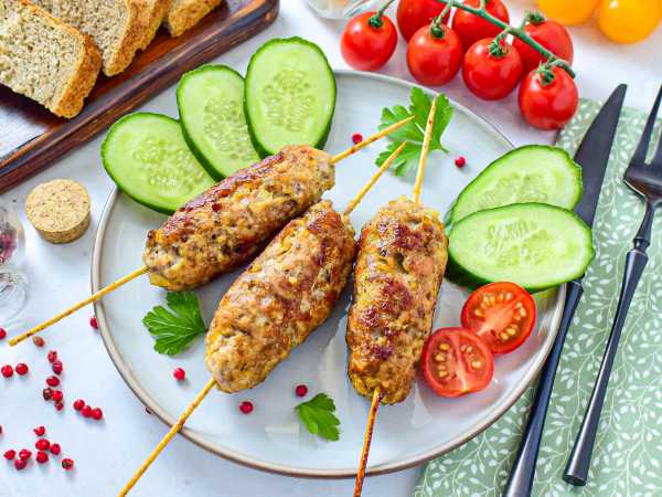 Разделить фарш на 4 части, сформировать кебабы и обернуть их беконом.