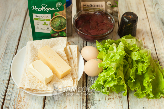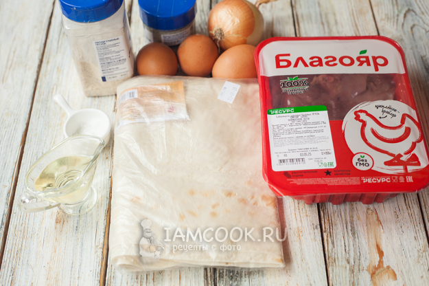 Вот всё, что понадобится для приготовления лаваша с куриной печенью на сковороде. В начинку также можно добавить 70-100 г тертого полутвердого сыра (по желанию), а вместо муки – взять такое же количество панировочных сухарей.