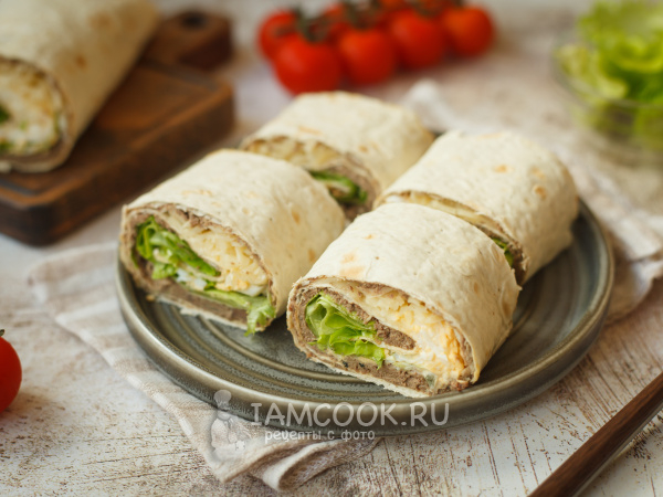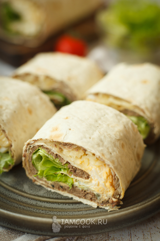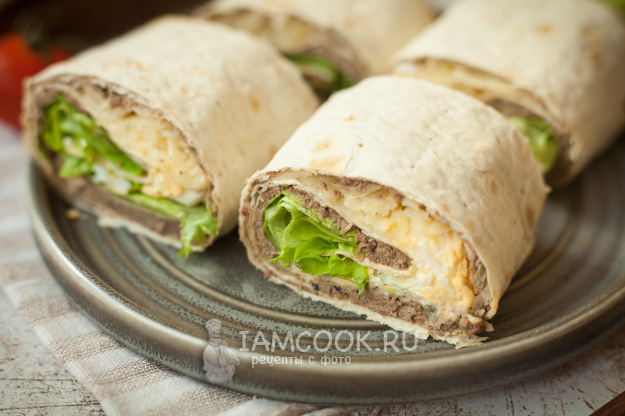 Осталось только свернуть лаваш с начинкой рулетом, начиная с листьев салата, по направлению к печеночному слою. Дальше оберните рулет пищевой пленкой и дайте пропитаться в холодильнике минимум 30 минут. Подавайте, нарезав на порционные кусочки.