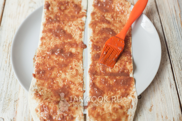 На каждую полоску нанесите измельченную печень тонким равномерным слоем.