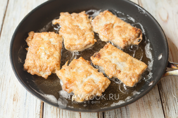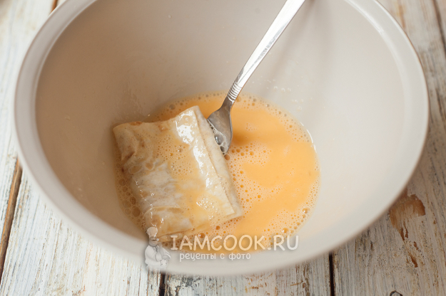 Оставшиеся 2 яйца вбейте в миску и взболтайте вилкой/венчиком до однородности (взбивать не нужно, достаточно просто хорошо смешать белок с желтком). Разогрейте сковороду с растительным маслом, окуните несколько заготовок закуски в яйцо и переложите на сковородку.