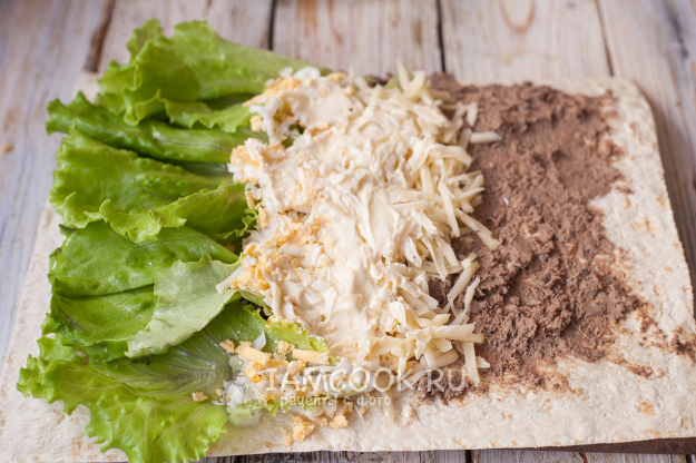 Расстелите лаваш на рабочей поверхности и смажьте печеночной массой, отступая от краев 2-3 см. На одну сторону выложите листья салата. Затем, чуть заступая на листья салата, выложите сплошной полосой яйцо, потом – тертый сыр. Сыр и яйцо смажьте небольшим количеством майонеза. Если по вашим ощущениям печень получилась суховатой, ее также можно промазать майонезом.