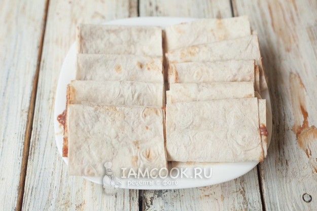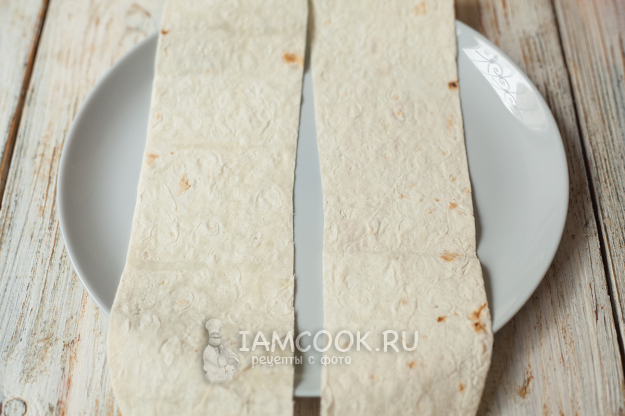 Нарежьте лаваш на примерно одинаковые полоски шириной 8-10 см.