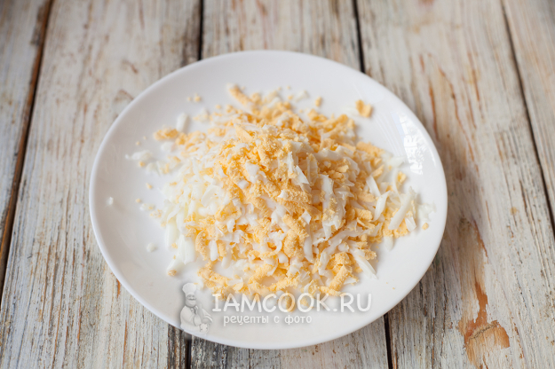 Параллельно с варкой или жаркой печени поставьте вариться яйца. После закипания проварите 7-9 минут (в зависимости от размера яиц) и дайте остыть в ледяной воде. Очистите яйца от скорлупы и натрите на крупной терке.