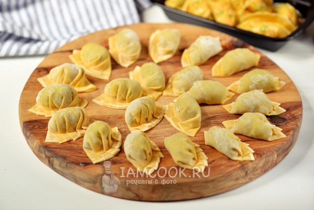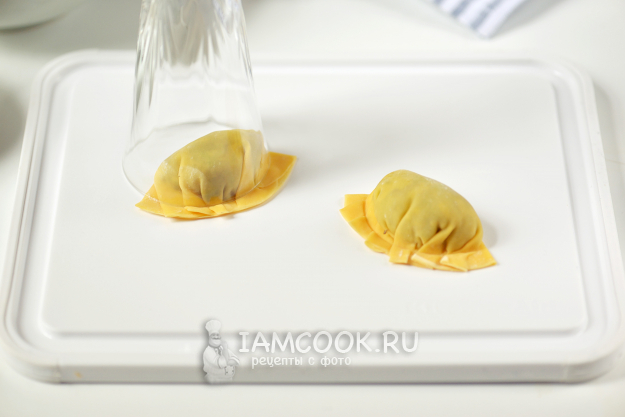 Сложите тесто пополам, верхнюю часть защипните, как показано на фото. Дальше рюмкой, стаканом (чем удобно) с небольшим горлышком слегка прижмите заготовки у начинки, отступив от края 0,5 сантиметра. Только без фанатизма, иначе во время варки "юбочка" может отвалиться. Это делаем не только для того, чтобы придать дамплингам вид покупных, но и чтобы они не развалились во время варки.