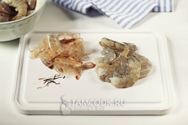 Креветочные хвосты очистите от панциря, сделайте сверху неглубокий надрез, удалите кишечник. Креветки помойте и просушите бумажными полотенцами.