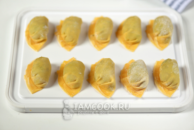 Все заготовки выложите на разделочную доску, оставьте при комнатной температуре минут на 10-15. Когда тесто чуть подсыхает, дамплинги лучше варятся в кипятке.