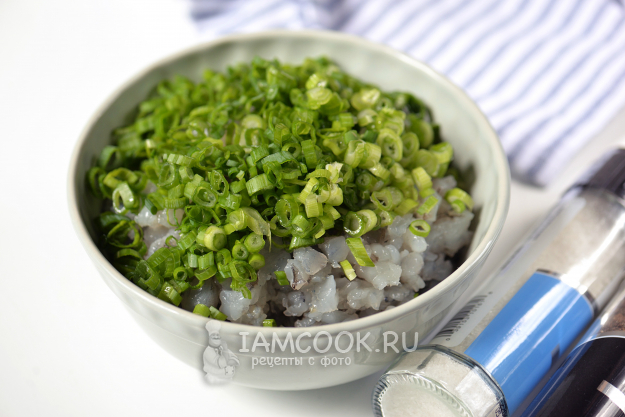 Переложите в удобную глубокую миску, добавьте мелко нарезанную зеленую часть лука, посолите и поперчите по вкусу.