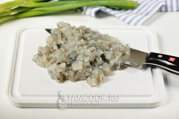 Дальше нарежьте креветки мелко, затем порубите ножом с крупным лезвием почти в фарш.