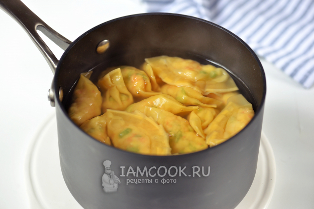 Вскипятите воду, чуть подсолите, выложите в нее дамплинги, сразу помешайте тыльной стороной ложки, чтобы не приклеились к дну сотейника. Готовьте около минуты после закипания: как только все они всплыли на поверхности воды - готово! Выловите с помощью шумовки или откиньте на дуршлаг.