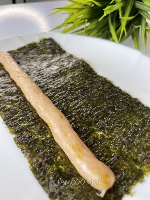 Листы нори разрезаем пополам и выдавливаем фарш полоской. Один край листа нори смазываем яйцом.