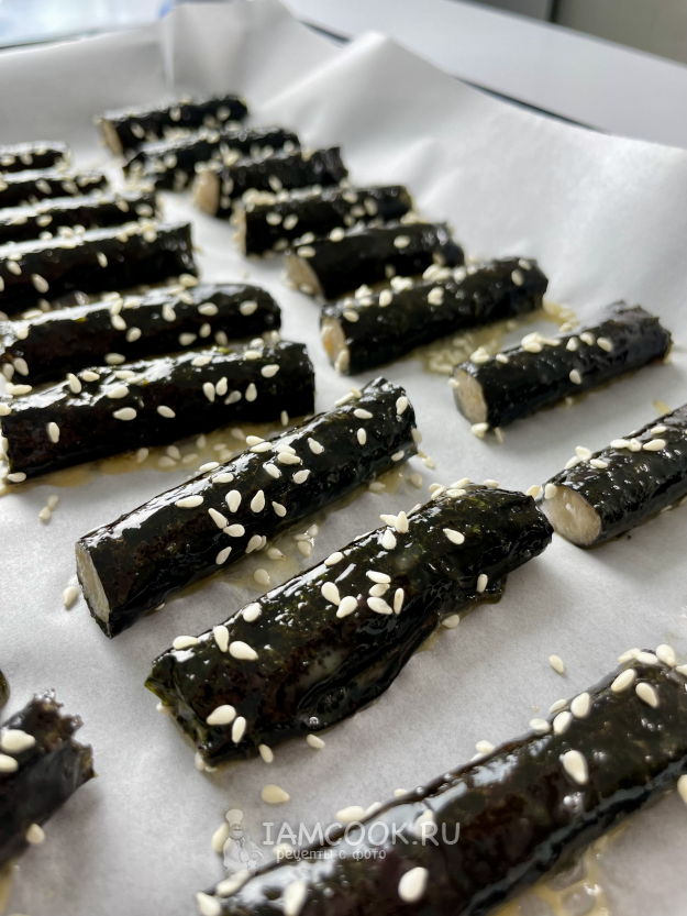 Выкладываем на противень и посыпаем кунжутом. Разогреваем духовку до 180 градусов и отправляем запекаться на 20 минут.