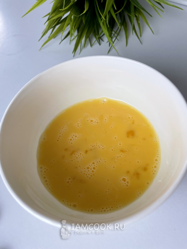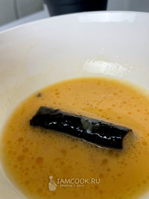 К яйцу добавляем кунжутное масло и перемешиваем. Затем нарезаем рулетики на кусочки и обмакиваем в смесь яйца и кунжутного масла.