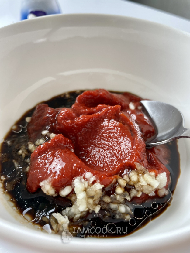 Пока закуска готовится, приготовим соус. В чашку выкладываем томатную пасту. Выдавливаем чеснок, наливаем соевый соус и кунжутное масло. Перемешиваем.