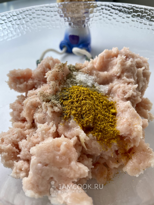 Добавляем соль, красный и черный перцы, карри и хорошенько перемешиваем.