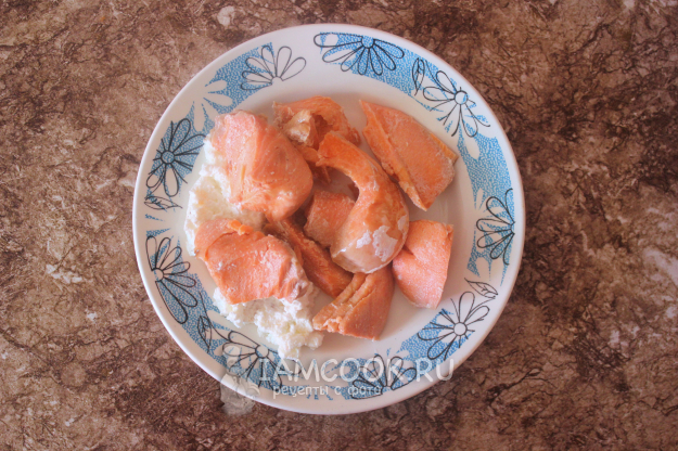Сварите или ещё как-либо приготовьте кусок/стейк форели. Раскрошите рыбу, слегка посолите и перемешайте её с творожным ингредиентом. Это и будет начинка.