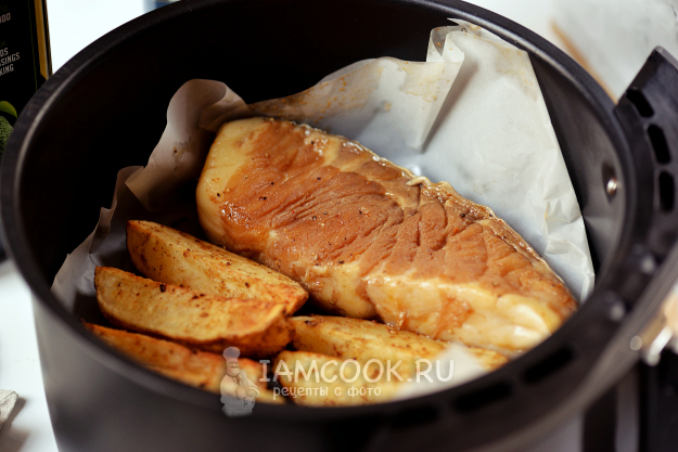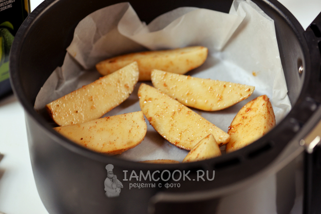 Сложите пекарскую бумагу вдвое, положите ее на дно чаши аэрогриля, выложите картофель. Время его приготовления сильно зависит от сорта, рассыпчатые сорта картофеля готовятся быстрее. Поставьте чашу в режим "Выпечка", 180 градусов на 10-15 минут. После сигнала проколите дольку-другую ножом: если он входит достаточно легко, можно добавлять рыбу. Если же нож практически не может проколоть картофельную дольку, отправьте чашу обратно в аэрогриль еще минут на 5 при той же температуре. Также следите, и если верх картофеля за это время хорошо подрумянился, переверните его кожурой вверх, чтобы не подгорел.