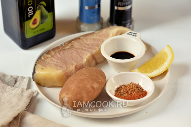 Соберите по списку все необходимые продукты для приготовления филе осетра в аэрогриле с картошкой. Осетрину помойте под проточной водой, вытрите насухо бумажным полотенцем. Также тщательно помойте картофель жесткой губкой или щеткой.