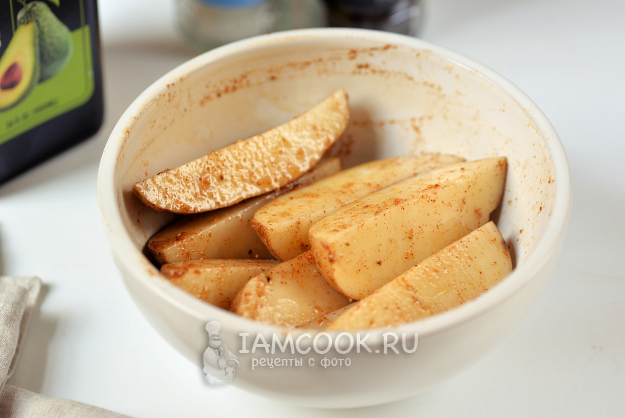 Картофель нарежьте четвертинками вдоль, положите в глубокую миску. Добавьте любое растительное масло, приправу для картофеля, соль и перец, хорошенько все перемешайте.