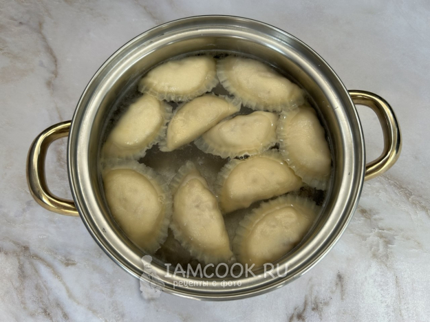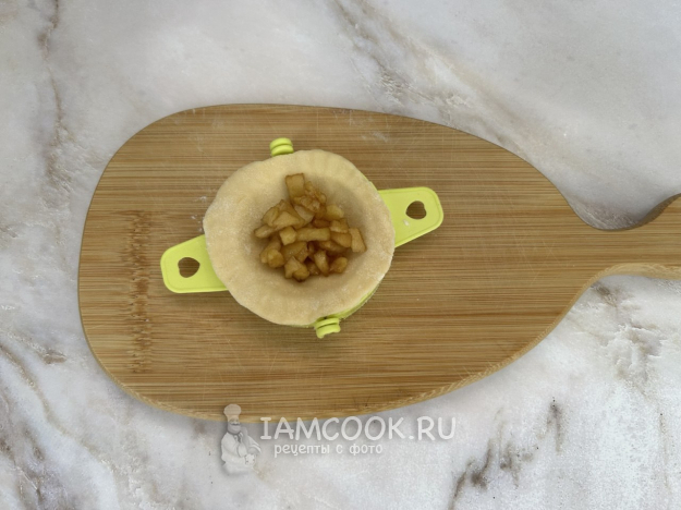 Положите немного начинки в центр каждого круга. Сложите кружочки пополам, плотно защипывая края пальцами. Убедитесь, что край хорошо запечатался, иначе при варке начинка может вытечь.