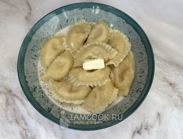 Положите в вареники кусочек сливочного масла. По желанию посыпьте сверху небольшим количеством сахарной пудры. Подавайте горячими сразу же после отваривания.