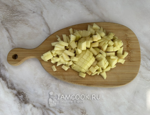 Очистите яблоки от кожуры и сердцевины. Нарежьте очищенные яблоки небольшими кубиками, размером около 1 см.