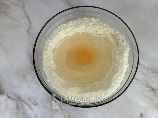 В большую миску просейте горкой муку. Сделайте углубление посередине муки и добавьте яйцо, соль и воду. Начинайте аккуратно замешивать тесто от центра к краям круговыми движениями. Продолжайте замес ещё около 5 минут, пока тесто не станет однородным, гладким и эластичным.
