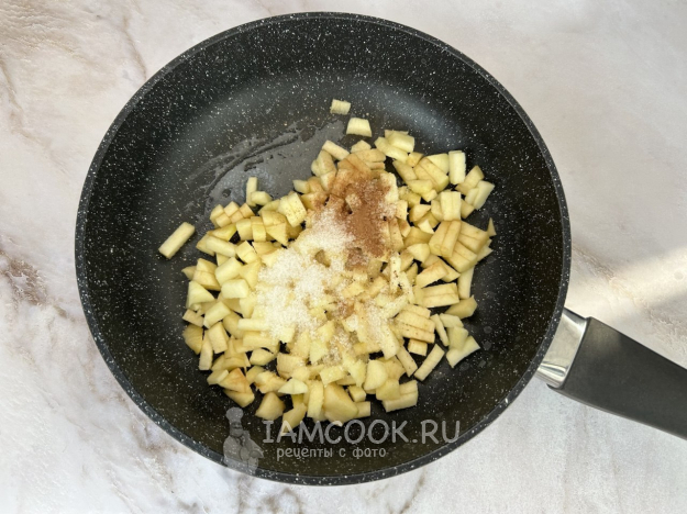 Растопите на сковороде 10-15 граммов сливочного масла, добавьте яблоки и обжарьте до золотистого цвета. Затем остудите.