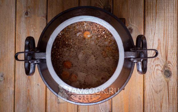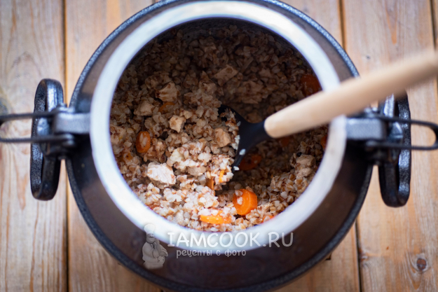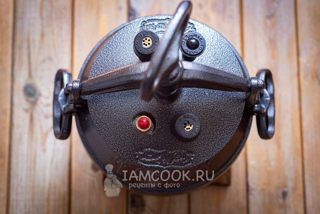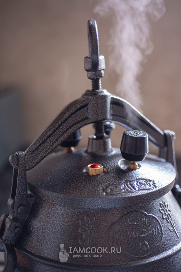 Дождитесь, когда из клапанов пойдет пар, уменьшите огонь до минимального и готовьте гречку с мясом в афганском казане на маленьком огне в течение 25 минут.