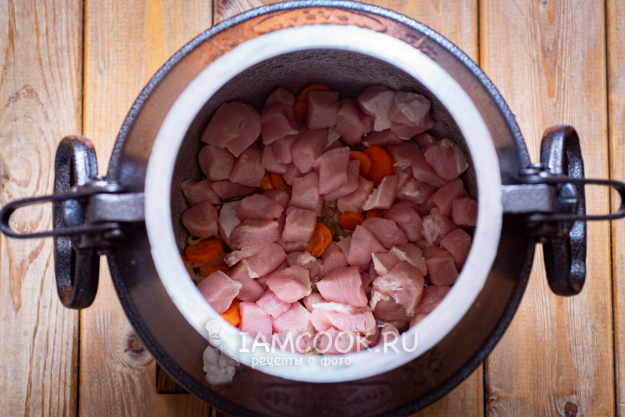 Затем казан с овощами снимите с плиты. Выложите к луку и моркови свинину.