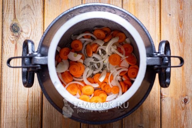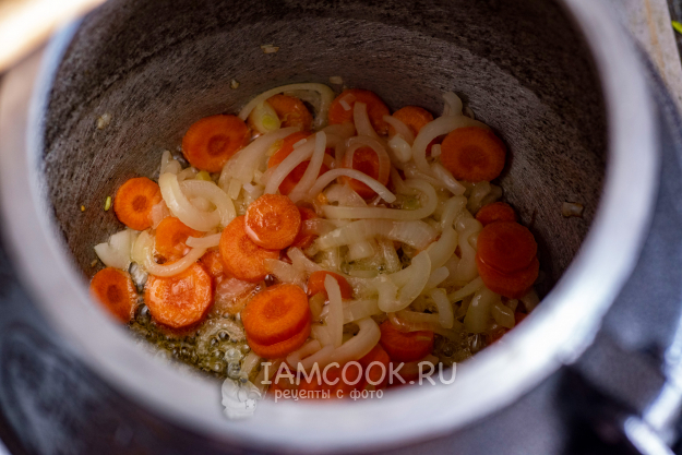 На дно казана налейте растительное масло и выложите лук и морковь.