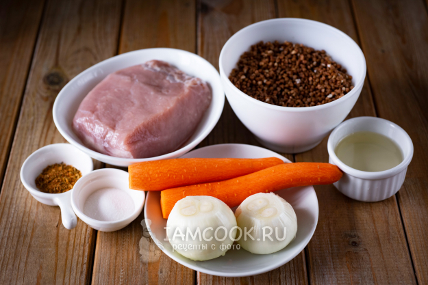 Все ингредиенты для приготовления гречки с мясом в афганском казане соберите по указанному списку. Морковь и лук почистите и помойте. Переберите и промойте гречневую крупу в нескольких водах.
