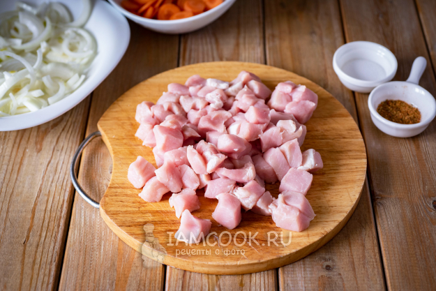 Мясо нарежьте небольшими кубиками.