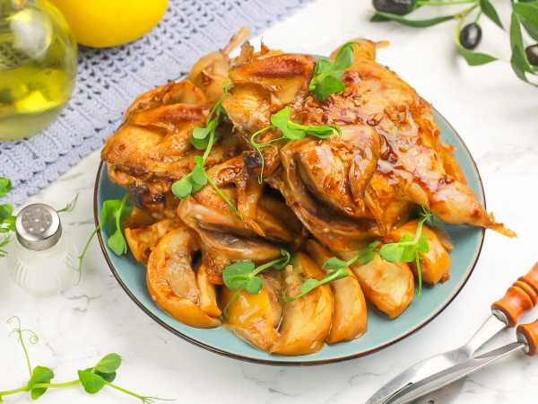 Томите около 30 минут при 200 градусах, затем переверните перепелов на другую сторону и убавьте нагрев до 180 градусов. Томите тыкву с перепелками в духовке еще 10-15 минут, в зависимости от величины тушек.