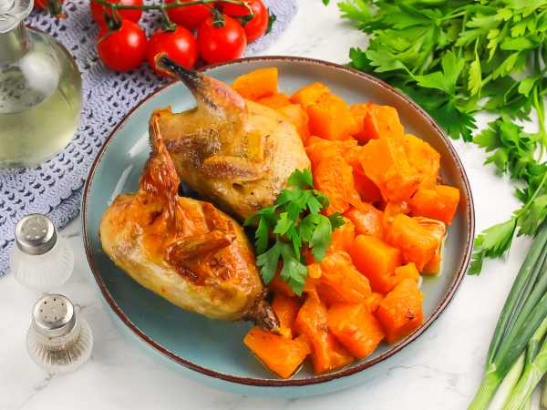 Выложите перепелов на тарелку и гарнируйте ароматной тыквой. Подайте к столу с соусами, лавашом, хлебом и т.д.