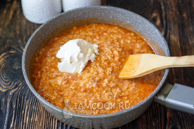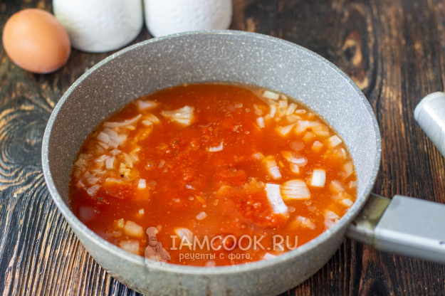 В сковороду с томатным соусом влейте горячую воду.