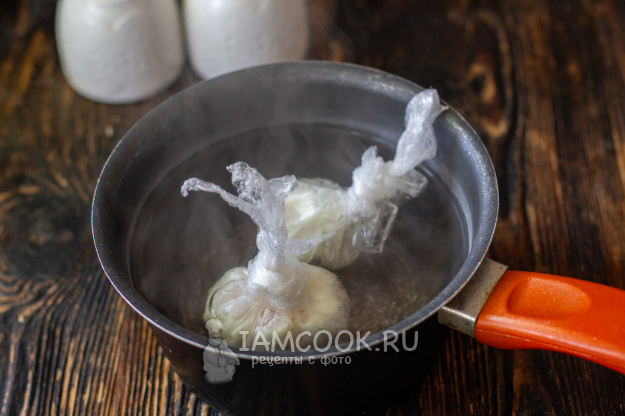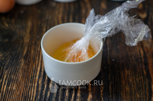 В кастрюле или сотейнике вскипятите воду, убавьте огонь до среднего и опустите в воду мешочек с яйцом. Варить 2,5-3 минуты, в зависимости от желаемой вами консистенции и размера яйца.