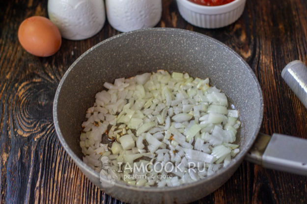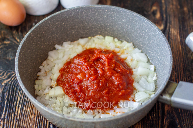 Влейте томатный соус и готовьте вместе с луком 2-3 минуты.