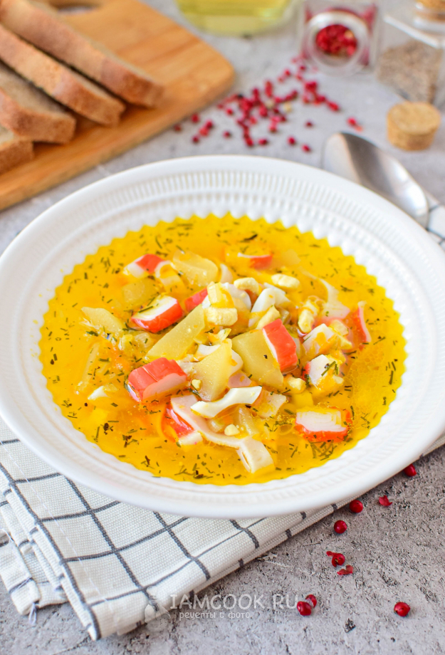 Готовый суп с крабовыми палочками и яйцом разлейте по тарелкам и подавайте к столу. Приятного аппетита!