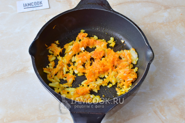 Лук мелко нарежьте, а морковь потрите на терке. Обжарьте овощи с добавлением растительного масла 2-3 минуты.