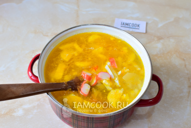 Нарежьте на кусочки крабовые палочки и отварные яйца. Отправьте их в суп.