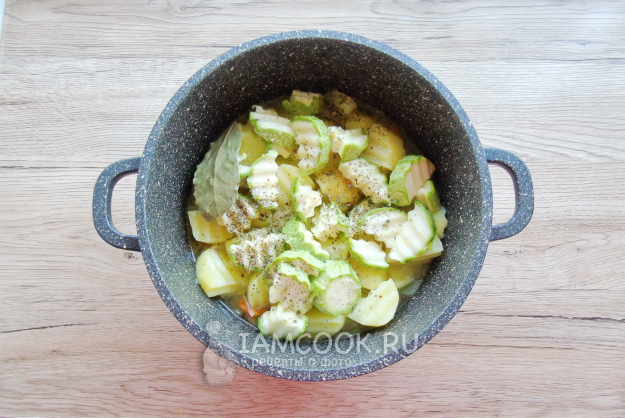 Накройте кастрюлю крышкой и тушите картошку с морковью и луком 15-20 минут. Кабачок помойте и очистите. Молодой можно не чистить. Нарежьте небольшими ломтиками и добавьте в кастрюлю. Выложите лавровый лист, приправьте сушеным базиликом, молотым перцем и солью.