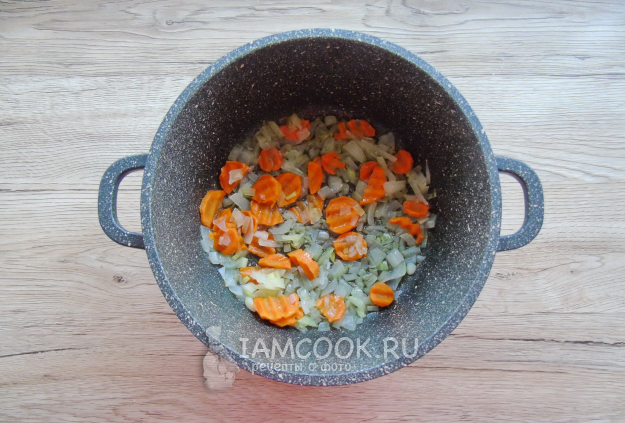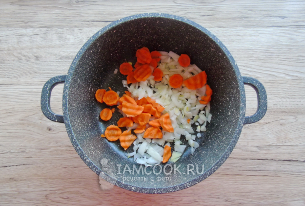 Морковь и репчатый лук очистите, помойте и нарежьте произвольно. Выложите в кастрюлю с толстым дном или антипригарным покрытием.