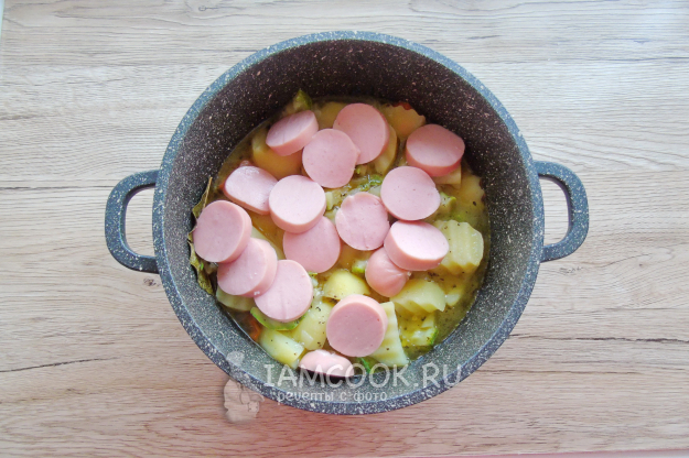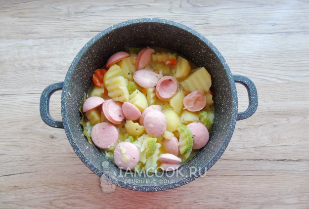 Тушите овощи до готовности. В конце приготовления добавьте нарезанные сардельки и чеснок, измельченный или пропущенный через пресс.