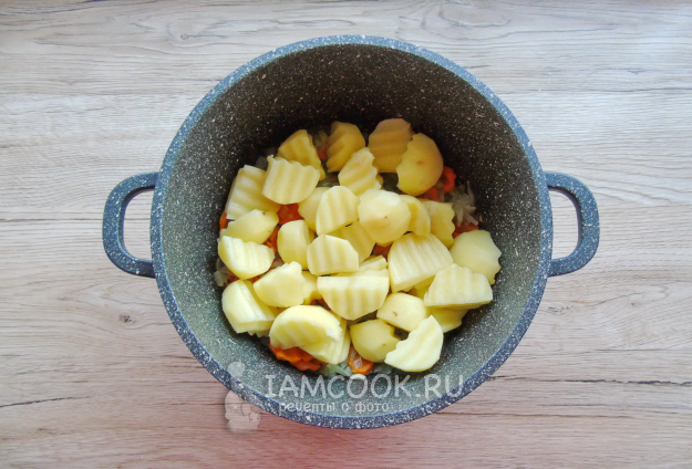 Картошку очистите, помойте и нарежьте не очень мелко. Добавьте к луку и моркови. Налейте 250-300 мл воды.