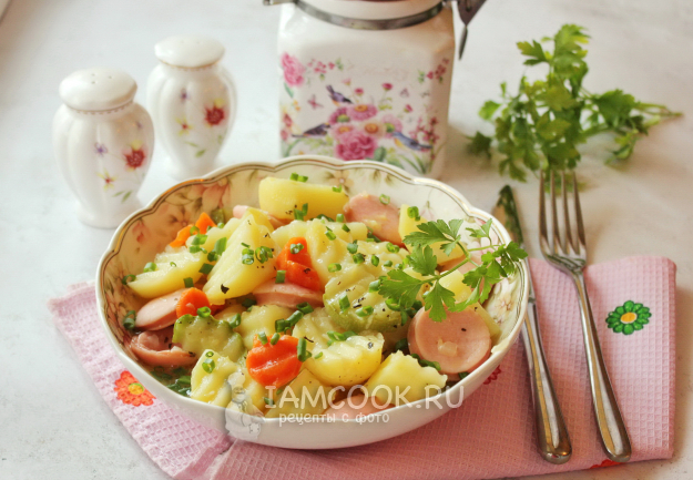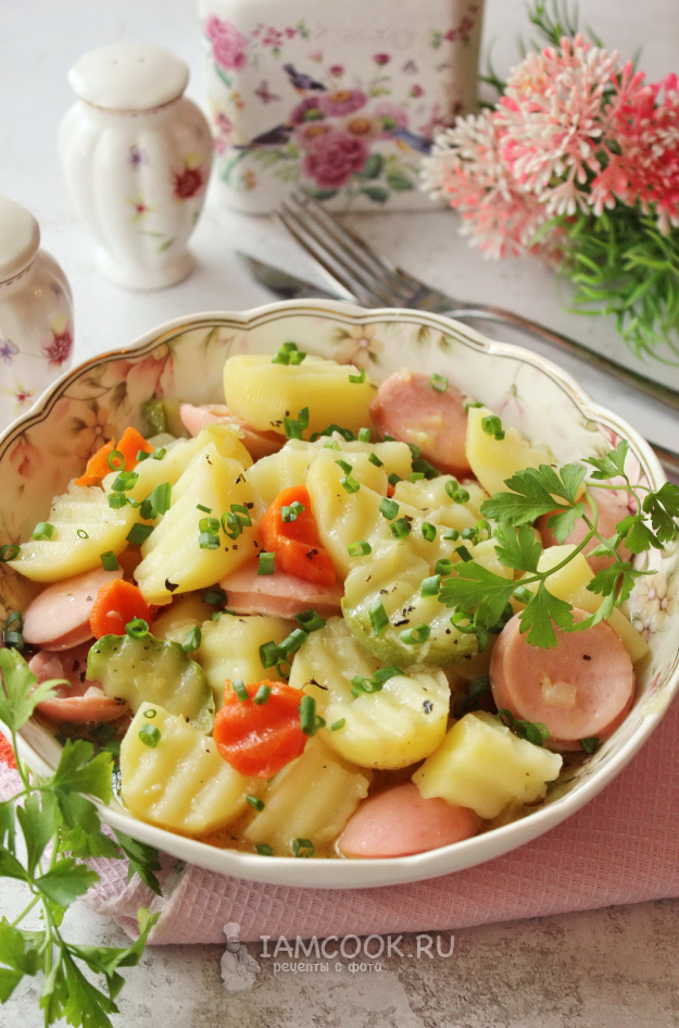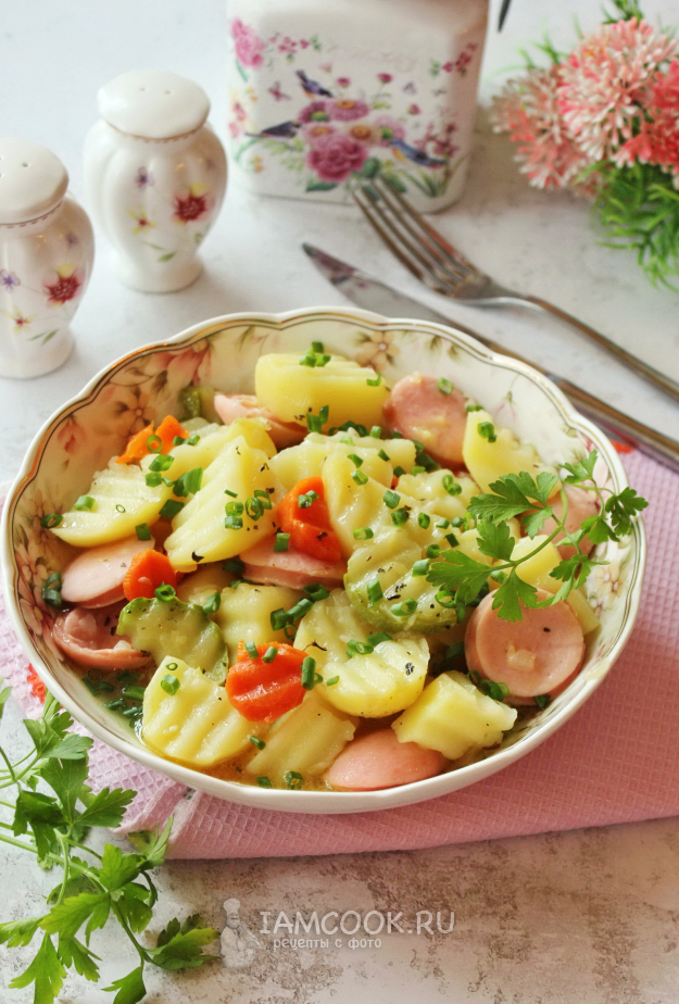Тушеная картошка с сардельками готова. Подавайте с соленьями или свежими овощами.